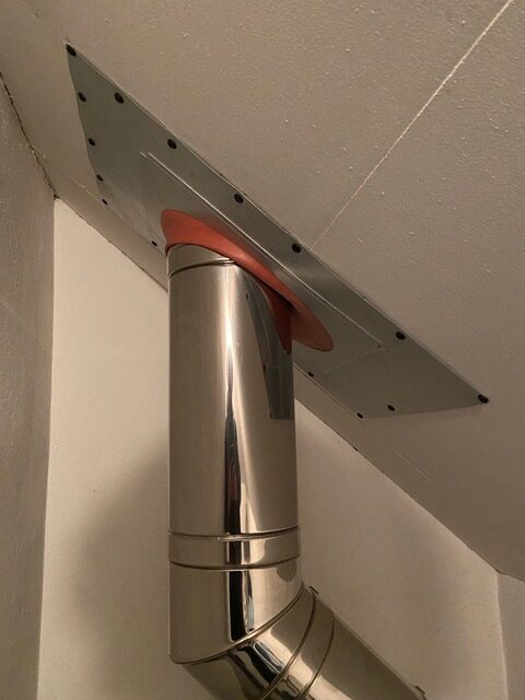 L’intervention a débuté par la pose d’un conduit Therminox (EDP) coloris noir, avec un passage plafond prévu suite au carottage de la dalle.