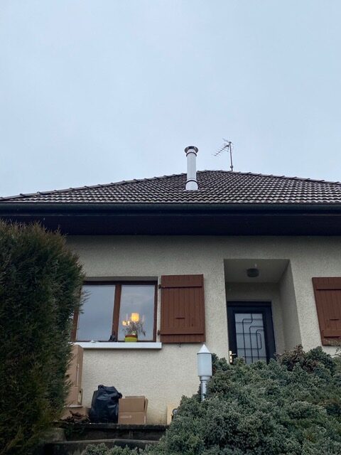 Les Compagnons du Feu sont intervenus à Bonne pour une pose complète de poêle à bois, comprenant l’installation du conduit, le passage plafond/toiture, l’étanchéité, la création d’une arrivée d’air et la mise en service finale avec le client.